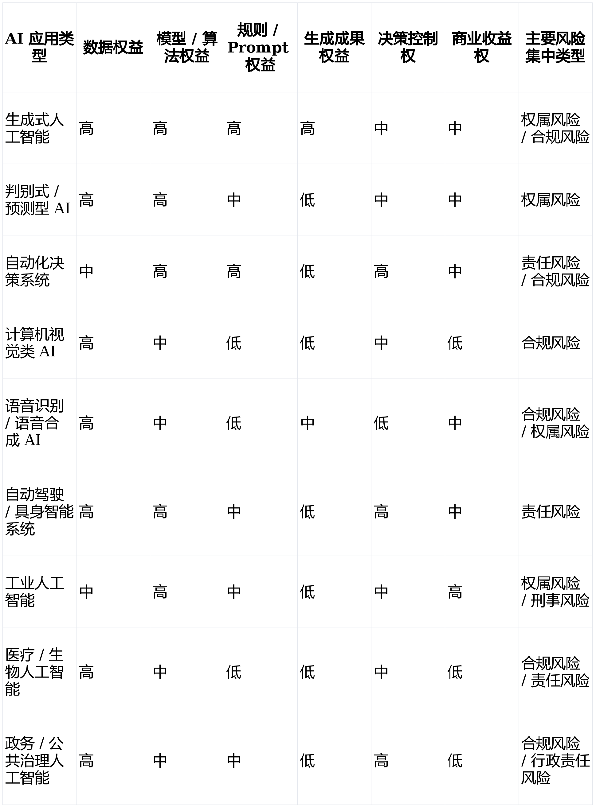 不只是手艺能力的合作,企业可否无效?分歧使用类型正在手艺布局、风险体例及权益构成径上具有显著差别,然而,通过表格形式呈现,为加强阐发的布局化程度取可操做性,2.“次要风险集中类型”系连系当前监管趋向、司法实践及财产使用环境,典型风险: - 锻炼数据来历不清激发侵权 - Prompt 或法则被复制 - 生成内容义务从体不明